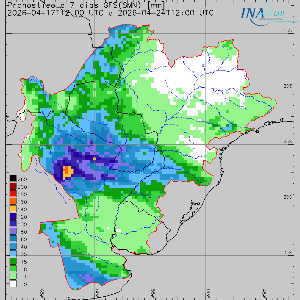 Las previsiones numéricas de precipitación para los próximos siete días indican el probable desarrollo de eventos precipitantes sobre la región central de la Cuenca del Plata. En este contexto, se proyectan precipitaciones escasas sobre la cuenca alta del río Paraná, y la cuenca del río Iguazú. Por otra parte, en la cuenca propia de Yacyretá, y el tramo incremental Yacyretá - Corrientes, se prevén acumulados moderados. En cuanto a la cuenca alta del río Paraguay, se estiman precipitaciones leves a moderadas, con los mayores montos concentrados sobre el sector norte del Pantanal. En continuidad con este escenario, sobre el tramo medio se prevén lluvias leves a moderadas, mientras que, sobre el tramo inferior se esperan precipitaciones ligeramente abundantes, con mayor intensidad en la cuenca media y baja del río Bermejo y el aporte directo por margen derecha. Asimismo, en la cuenca media del río Paraná (particularmente, en los aportes por margen derecha del tramo Corrientes - Goya), y en la cuenca del río Salado Santafesino, se proyectan precipitaciones con posibles núcleos abundantes sobre la cuenca media, con tendencia de disminución a acumulados leves sobre la cuenca baja. Asimismo, es probable que nuevamente se registren núcleos extensos y abundantes en la región de los Bajos Submeridionales. En la cuenca media y alta del río Uruguay, se estiman lluvias leves. A su vez, se prevén precipitaciones mayormente leves en la cuenca del río Carcarañá, mientras que en la cuenca del río Salado Bonaerense, se esperan lluvias leves a moderadas, con posibles núcleos ligeramente abundantes sobre la margen sur.